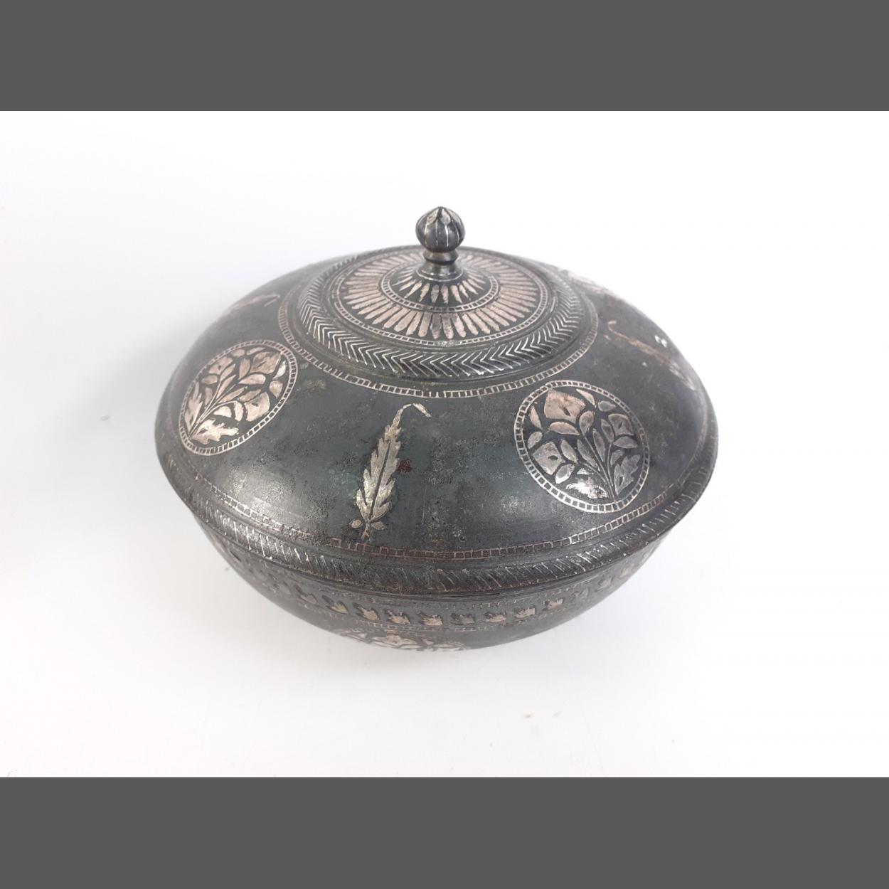 An Indian BIDRI style lidded medicine bowl with silver inlay. Measures 130mm diameter approx and stands 100mm high approx to finial. A rare item, this one does have damage as shown in photo but does display rather well.