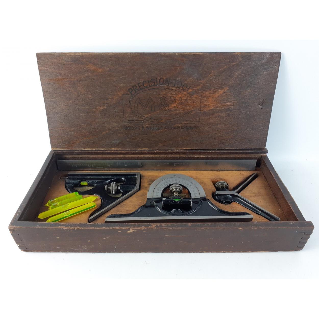 WRIGHT & MOORE Antique Precision Tools. A lovely boxed complete set of protractor and set square complete with additional level bubbles. A beautiful set in super complete condition.