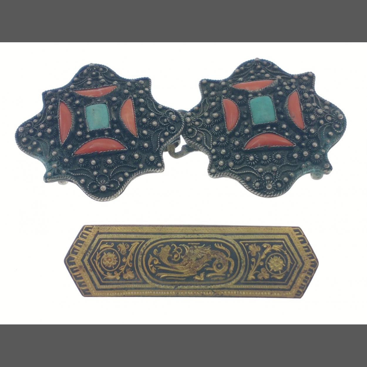 A small Nepalese style belt buckle pair, crudely stamped CHINA. Bought on the hippy trail back in the 1970s man ! Includes one other small brooch measuring 55mm approx.