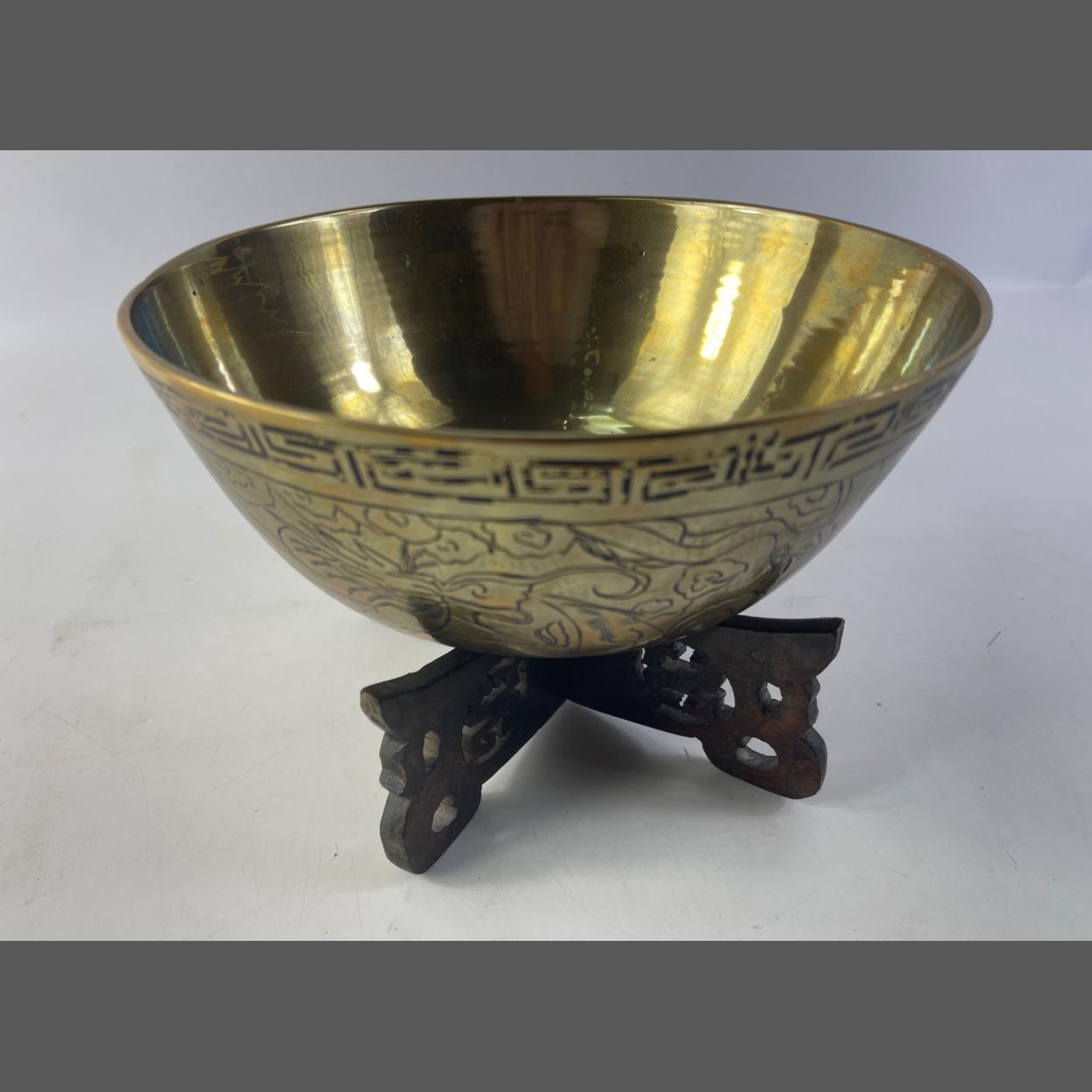 ORIENTAL brass bowl with a hand carved stand - dimensions 20cm diameter x 9cm(bowl only)