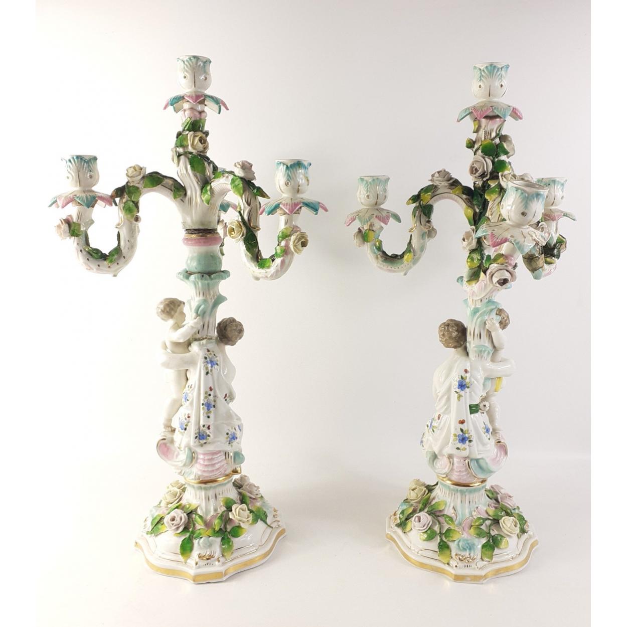 A pair of DRESDEN over-glazed blue crossed swords stamped to base porcelain three branch candelabra c1890 adorned with flowers with mother and child - both candelabra have sustained damage/repairs to the separation part of the stems, and one of the arms has been damaged repaired on one candelabra, and on the other candelabra there is wire-work to support the stem - otherwise no chips detected on any of the edges or flowers - height of both is 52cm height x 25cm width approx