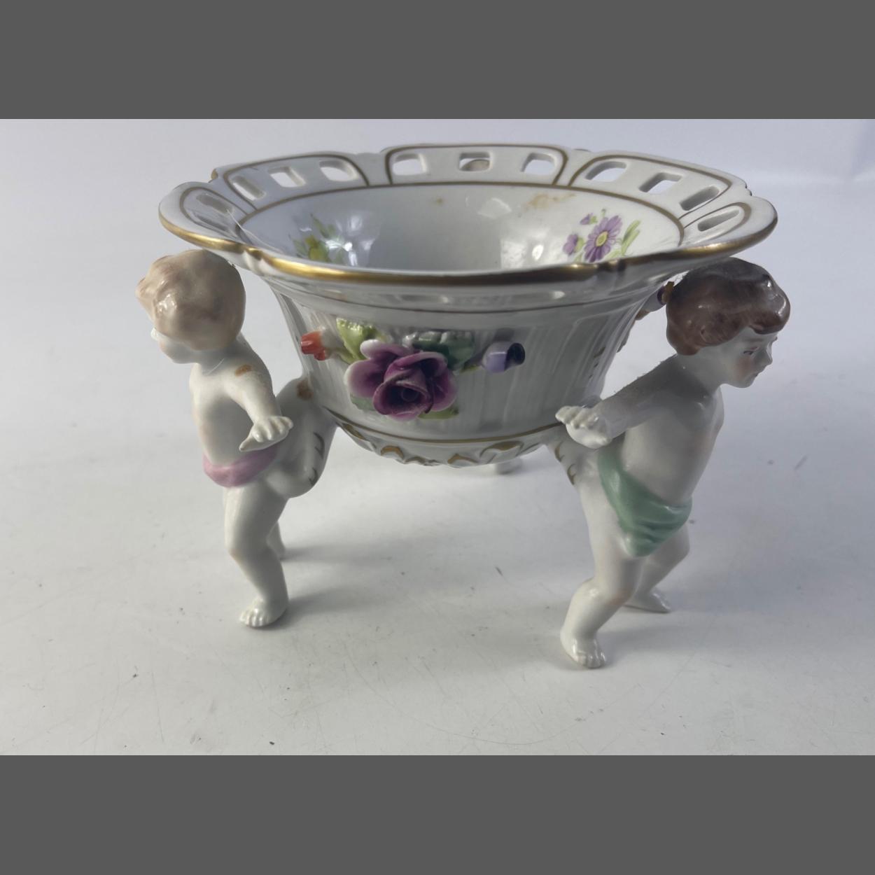 PMP 1817 stamp Porcelain pierced bowl supported on three cherubs holding their hands out - one child's thumb is missing, but all else is intact - dimensions 10.5cm height x 14cm diameter
