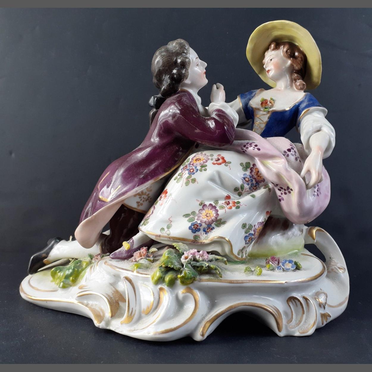 A German figurine group of a courting couple. Attractive colourway and in generally good condition with a minor chip to the gentleman's cloak. 17cm tall. An attractive piece.