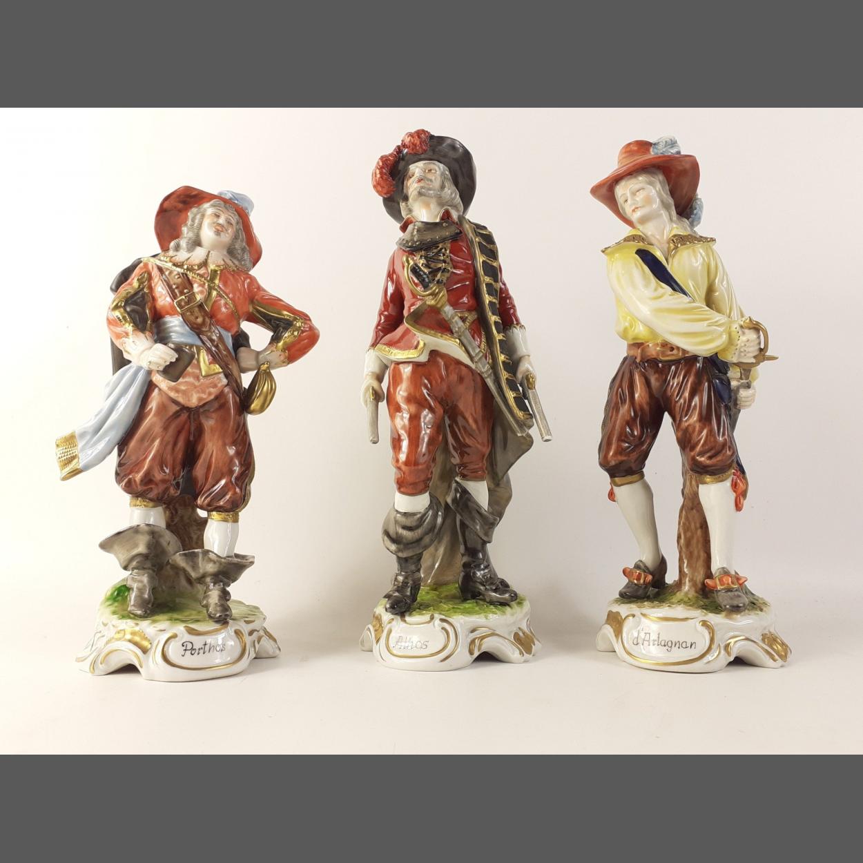 Three WHAL ceramic figures marked Unter Weiss Bach depicting D'Artagnan, Porthos, Athos. Lovely colouration and beautifully sculpted. Minor damage to D'Artagnan sword hilt