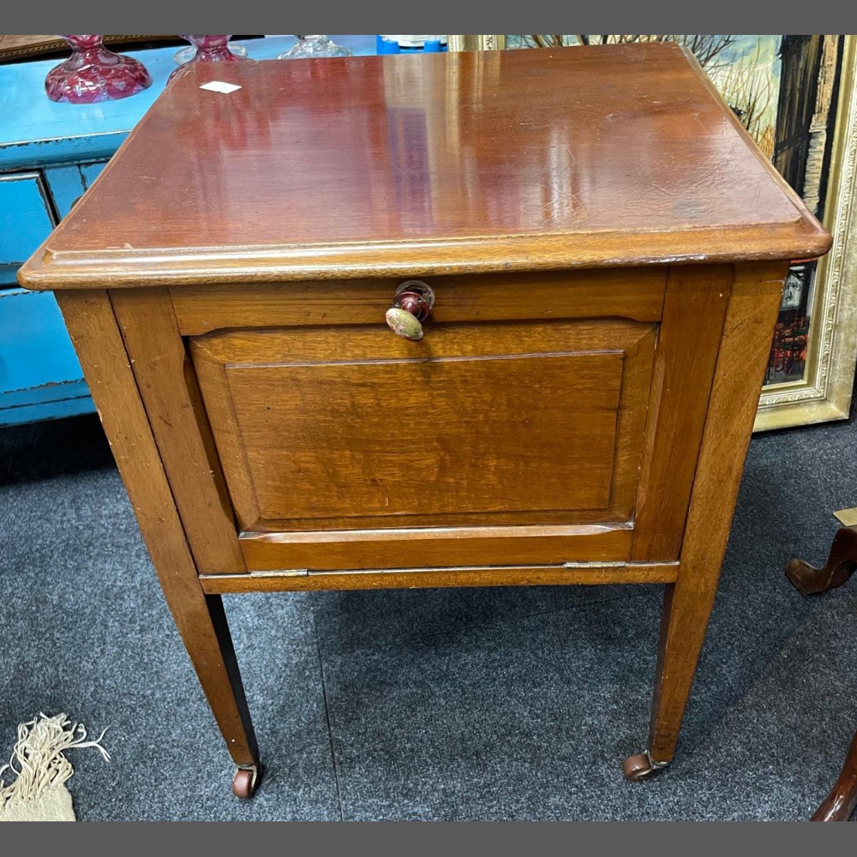 An Edwardian bedside pot cupboard with original porcelain casters and drop down door. Dimensions 21" wide. 19" deep and 26" high