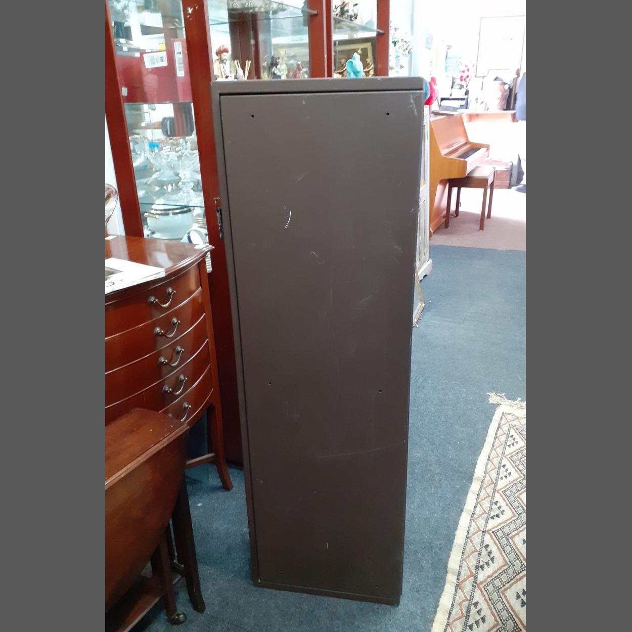 A tall racked metal gun cabinet with keys standing 130cm tall and in good useable condition.
