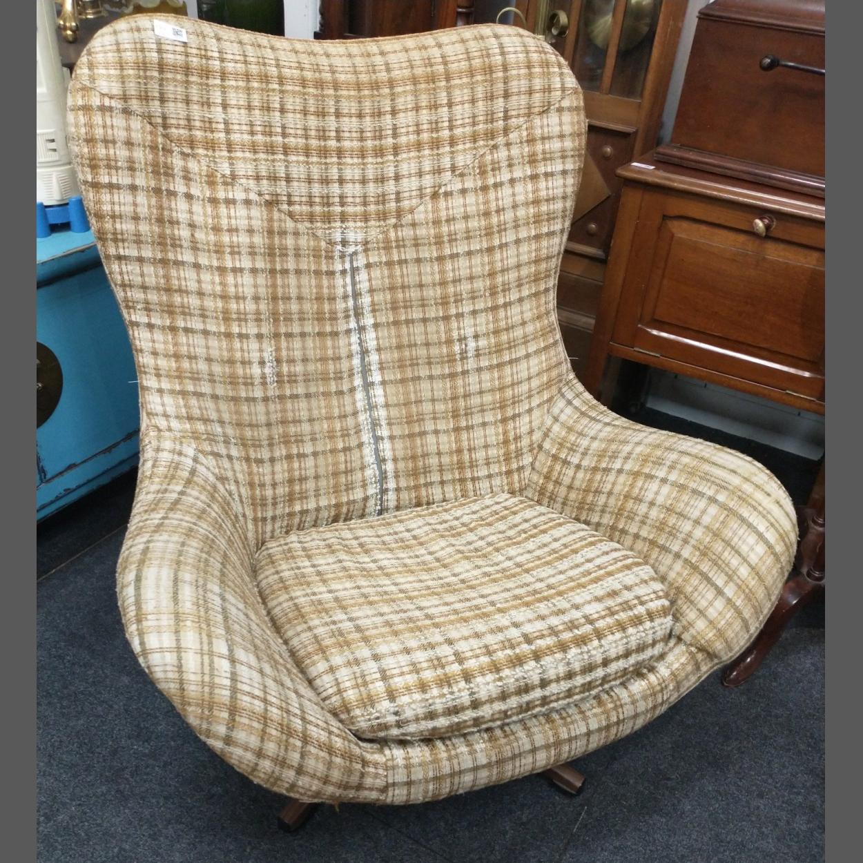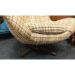 An iconic mid-century Swedish SWEDFURN swivel egg armchair in original brown and cream check fabric covering. Super comfortable to sit on, it measures 95cm to top of the back of chair, 85cm width, seat is 40cm from ground. The chair is missing the back cushion and there is some wear to the fabric on the arms as is to be expected on a chair of this age.