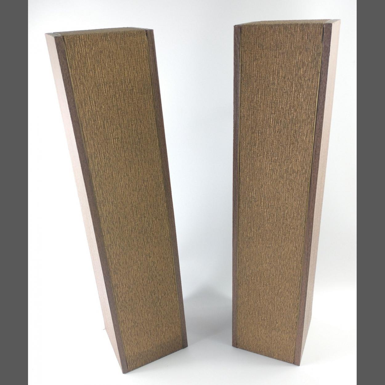 A pair of discreet speakers in wood with bronze fabric centres which can be wall-mounted measuring 61cmH x 14cmW x 13cm D