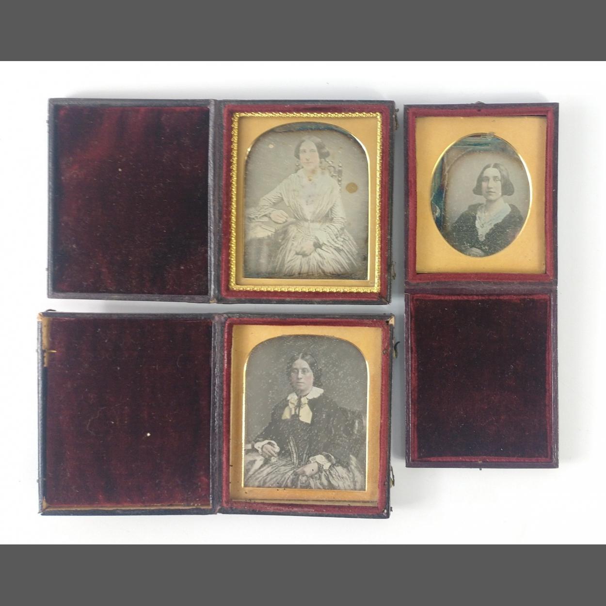 Three mid-19th century daguerreotypes of seated Victorian ladies in velvet lined leather cases 9x7cm
