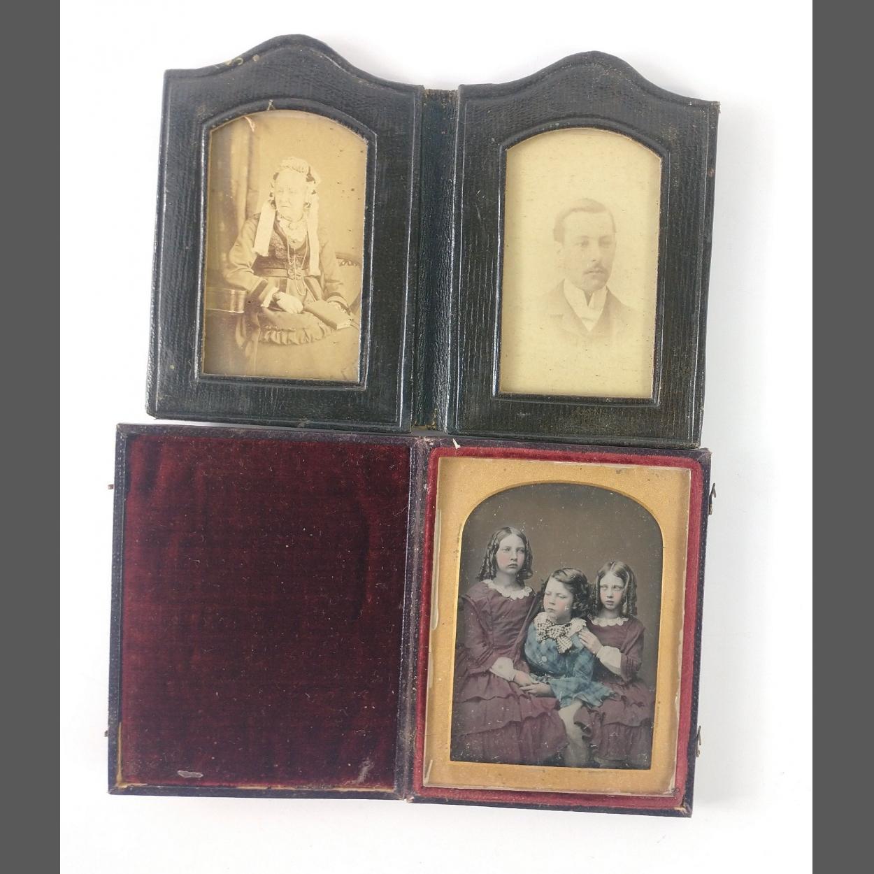 A mid-19th century daguerreotype of 3 young girls with beautiful ringlets in a velvet lined case 12x9.5cm and a leather portable frame containing photographs of an elderly lady and a gentleman, frame size 12.5x8.5cm