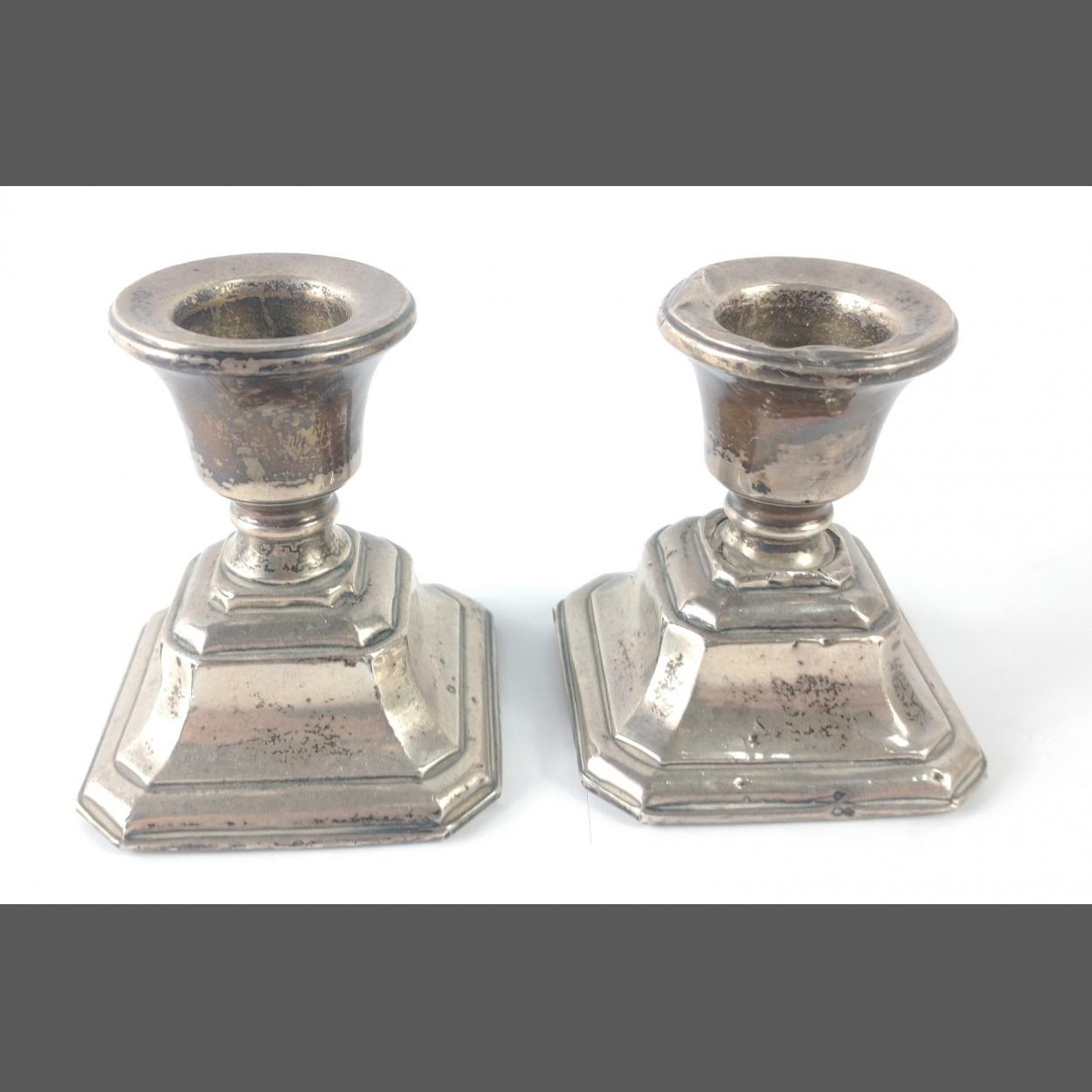 A pair of small silver candlesticks, Birmingham 1933, gross weight 257g approx, 7cm high with some dents in one piece