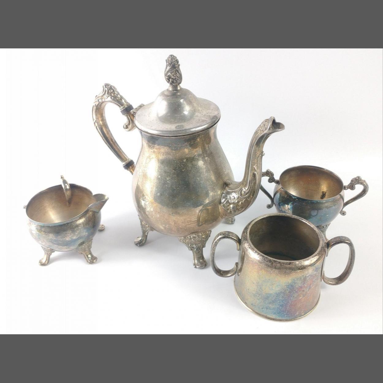 An old white metal coffee pot with cream and sugar (cream handle broken but present) and also a double-handled Sheffield EPNS sugar bowl