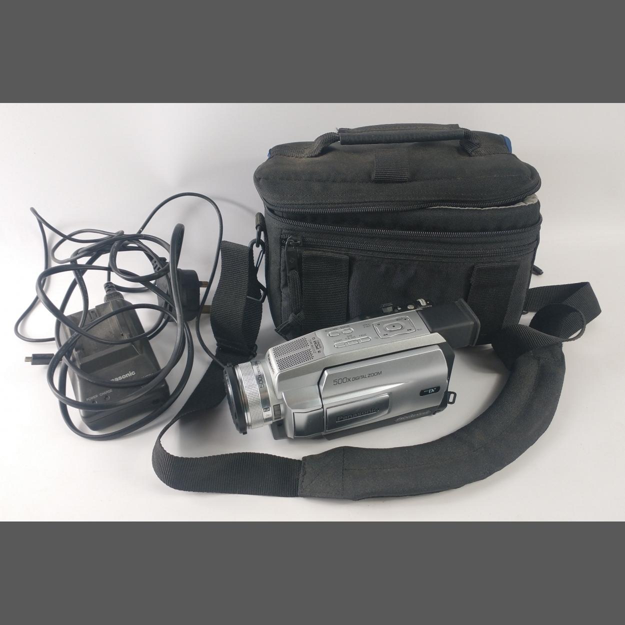 A Panasonic Progressive 500x digital zoom camera in carrying case with remote control and power cable