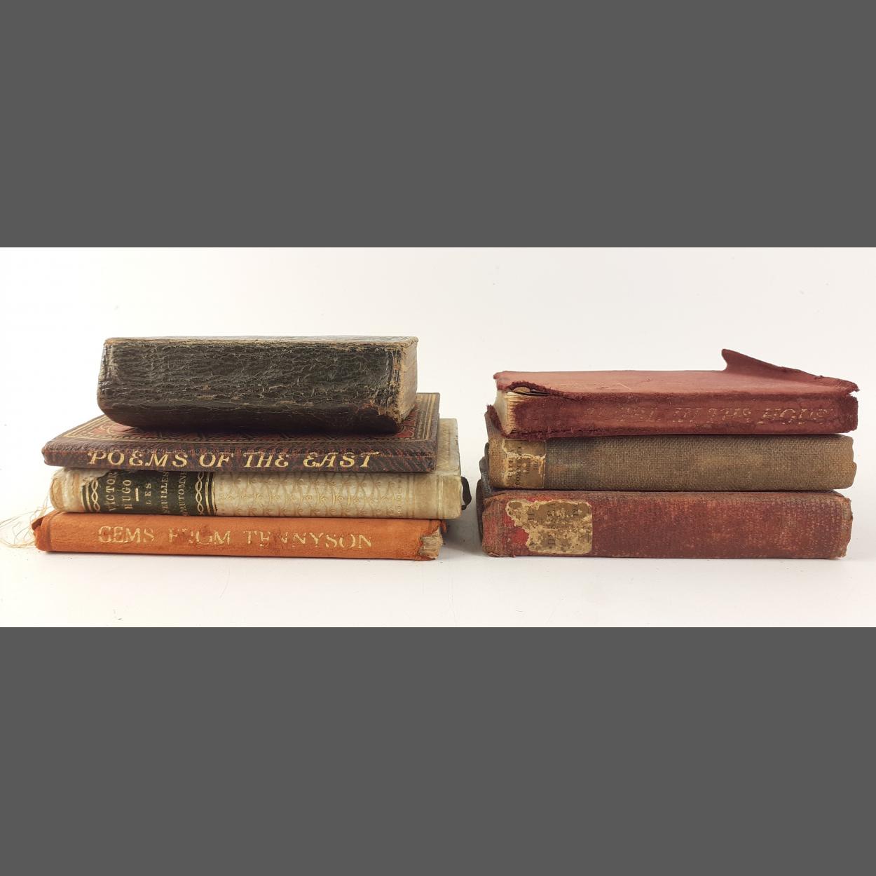 A small collection of 7 VINTAGE MINIATURE BOOKS, some dating from the late 1800s. To include a leather-bound Psalm book measuring approx. W5cm x H8cm x D2cm (date pencilled as 1888), SESAME BOOKLETS (George G. Harrap & Co., Covent Garden, London) "The Angel in the House" by Coventry Patmore, "Poems of the East" (Sesame Booklets), "Gems from Tennyson" (Collins), Homer's "Odyssey" in Greek, Dante's "Divine Comedy" in Italian and Victor Hugo's "The Leaves of Autumn" in French. Generally in reasonable condition, but with dog ears from loving use.