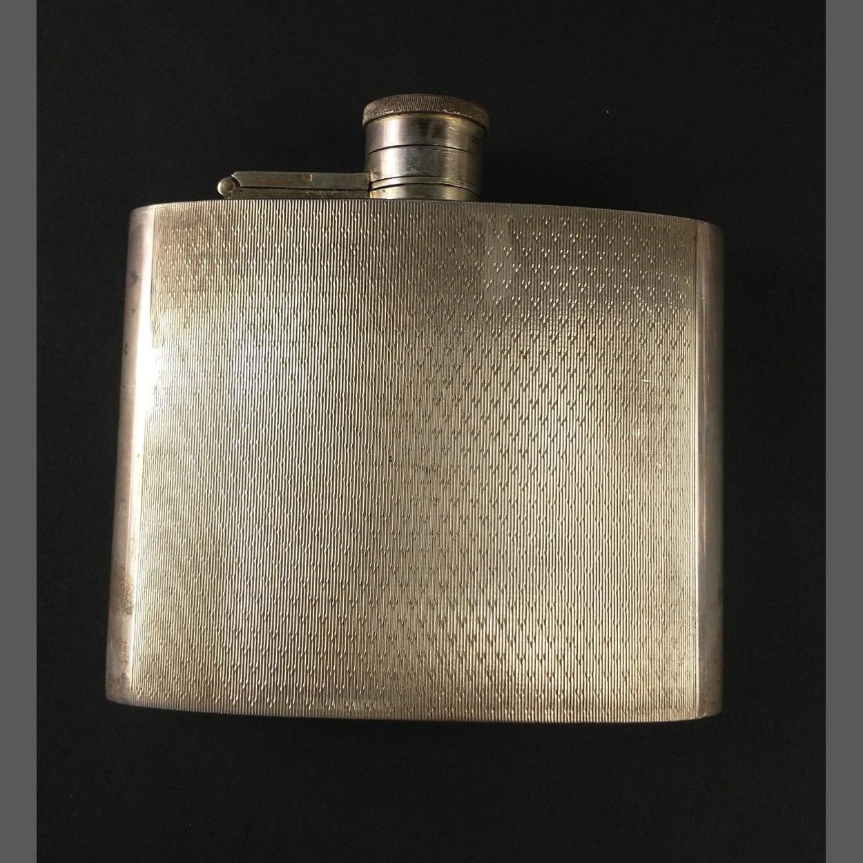 Engine turned fronted SOLID SILVER Hip flask Hallmarked Birmingham 1919, Silversmith JB Chatterley & Son - dimensions 9.5cm x 9.5cm approx - weight 148g approx