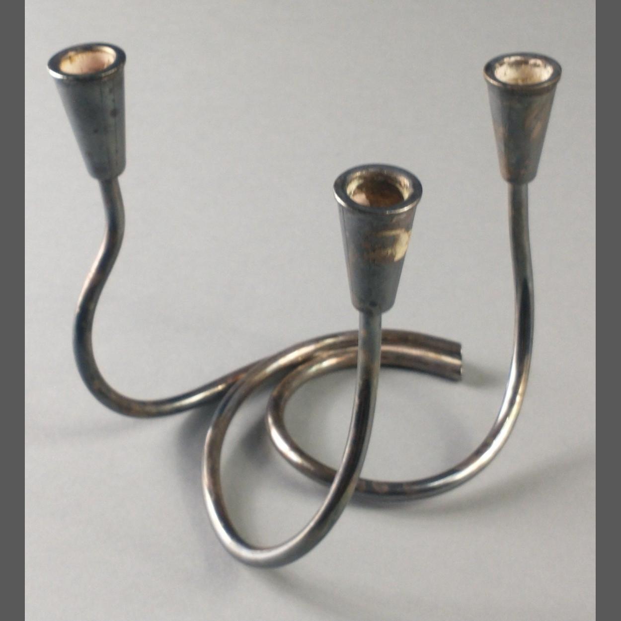 An elegant three-pronged candlestick stamped "CC Denmark" stands approx 10cm high, weight approx 135g