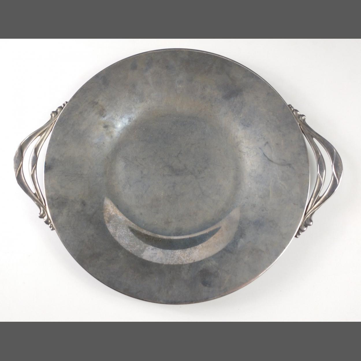 A Danish two-handled decorated tray stamped "silverplate on brass. Made in Denmark E DRAGSTED" 26cm dia approx, weight 450g approx