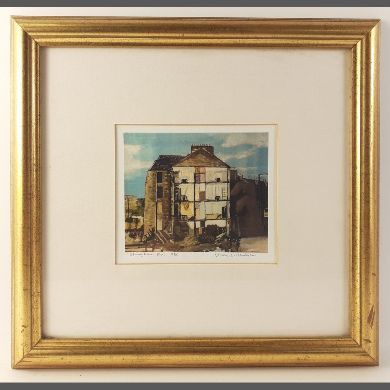 A print called "Springburn Road 1980" by GORDON G HENDERSON, frame 36cm x 34cm, visible work 14cm x 12cm approx