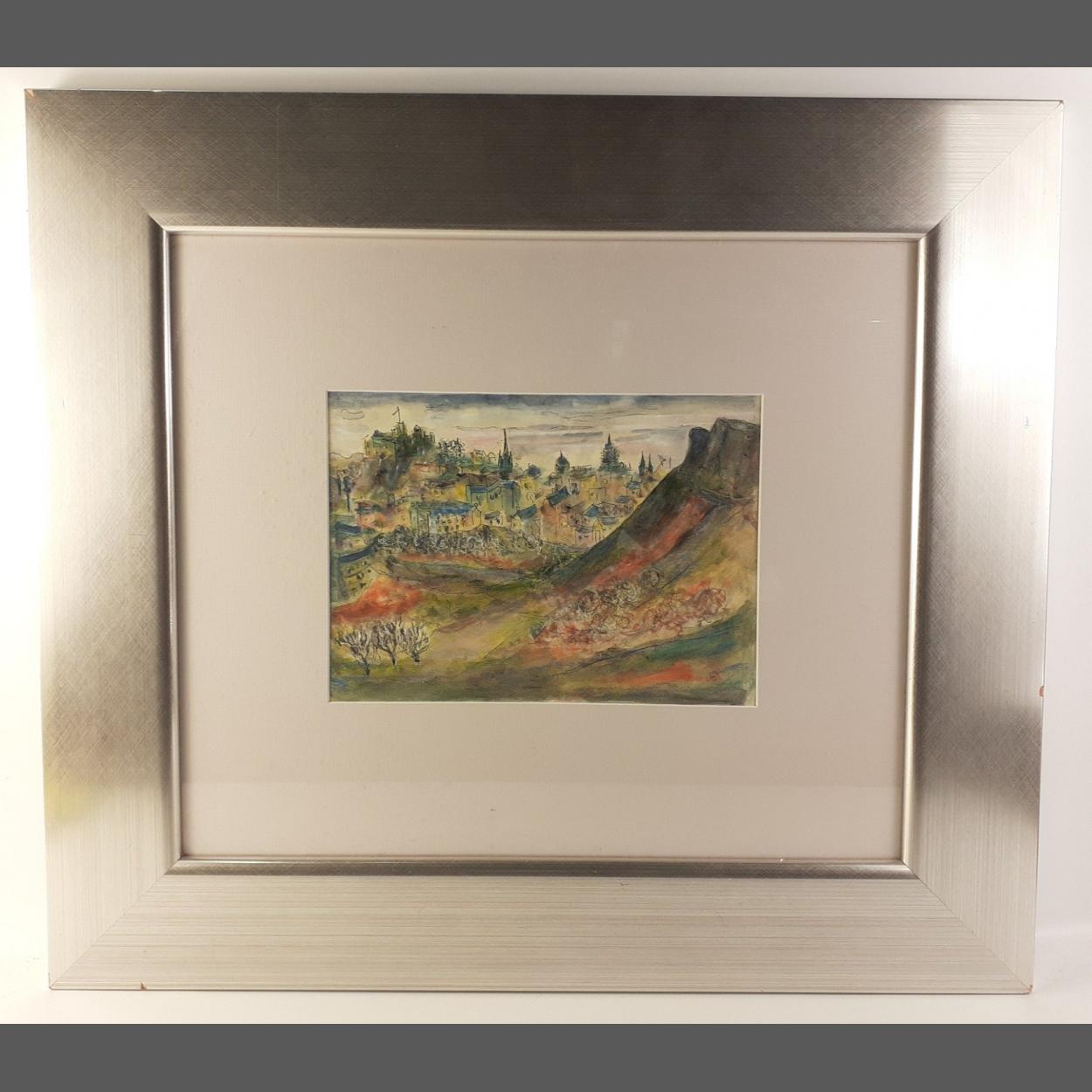 An original mixed media watercolour and ink scene of "Nightfall Over Edinburgh" signed CONNIE BYROM frame size 67cm x 59cm, visible work 29cm x 21cm, modern silver frame is slightly damaged