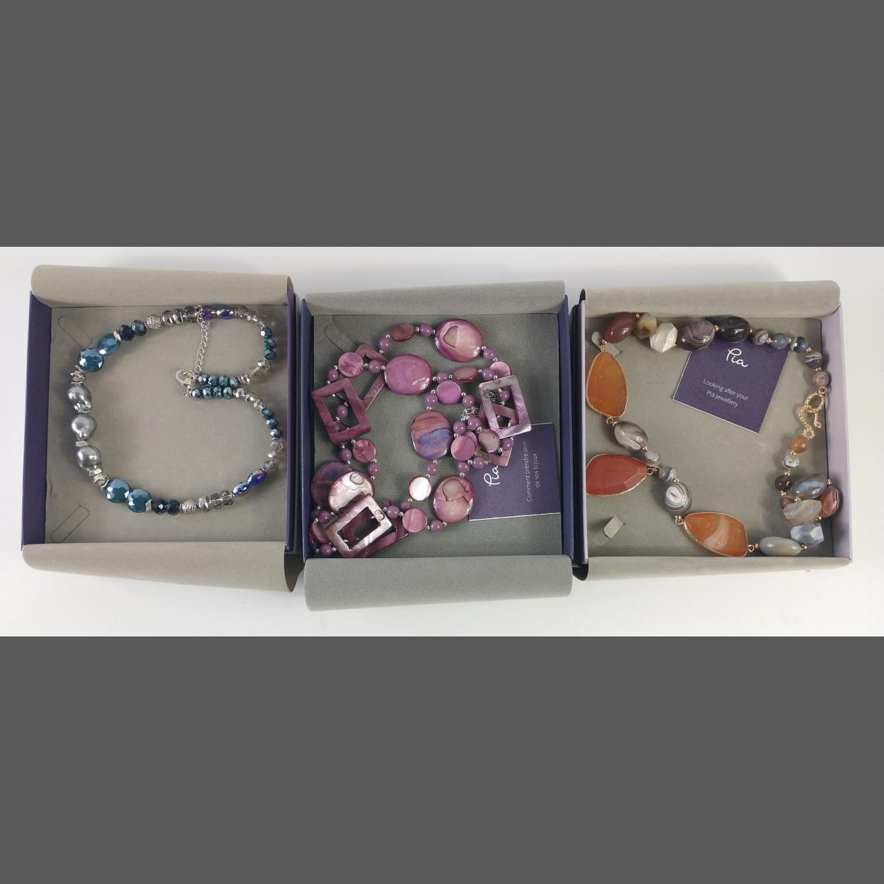 Three PIA necklaces to include one purple double-stranded approx 24cm long, one with chunky natural stones 48cm approx, and one silver and blue approx 45cm