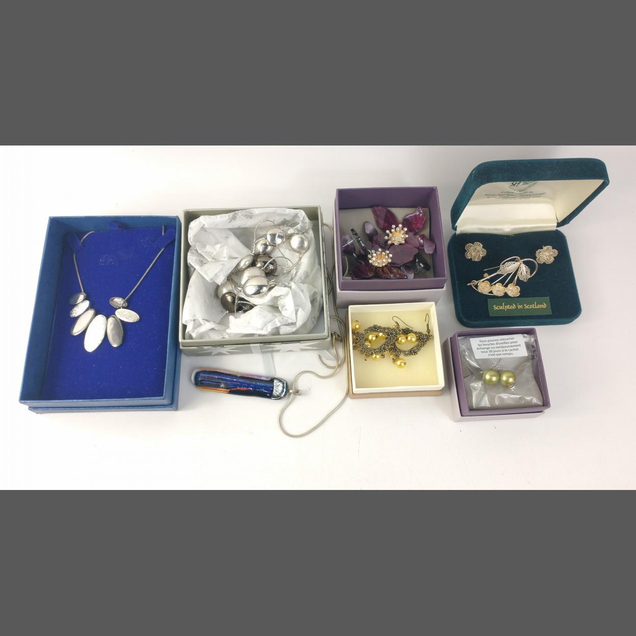 A mixed lot of costume jewellery to include a boxed white metal necklace 40cm long approx, a boxed necklace of white beads approx 100cm long, a pair of PAST TIMES metal and yellow bead hoop earrings 7cm long approx, a pair of purple PIA flower-shaped earrings approx 7cm long, a pair of PIA gold-toned bead earrings, and a white metal filigree brooch (approx 6cm long) and matching earrings