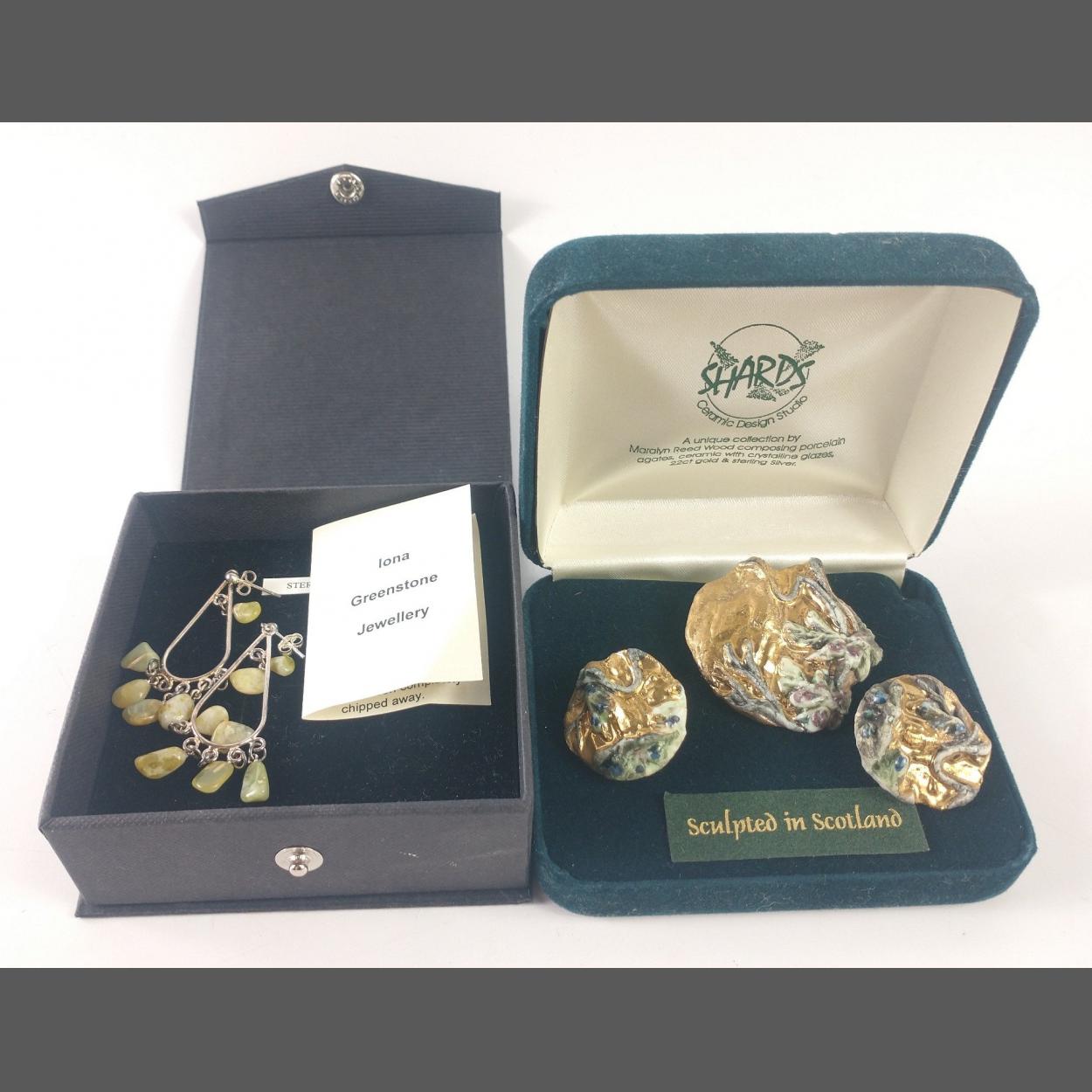 Quality jewellery made by crafts people to include a pair of drop earrings with hanging greenstones approx 5cm long and an unusual brooch (5cm width) with matching earrings (2.5cm dia)