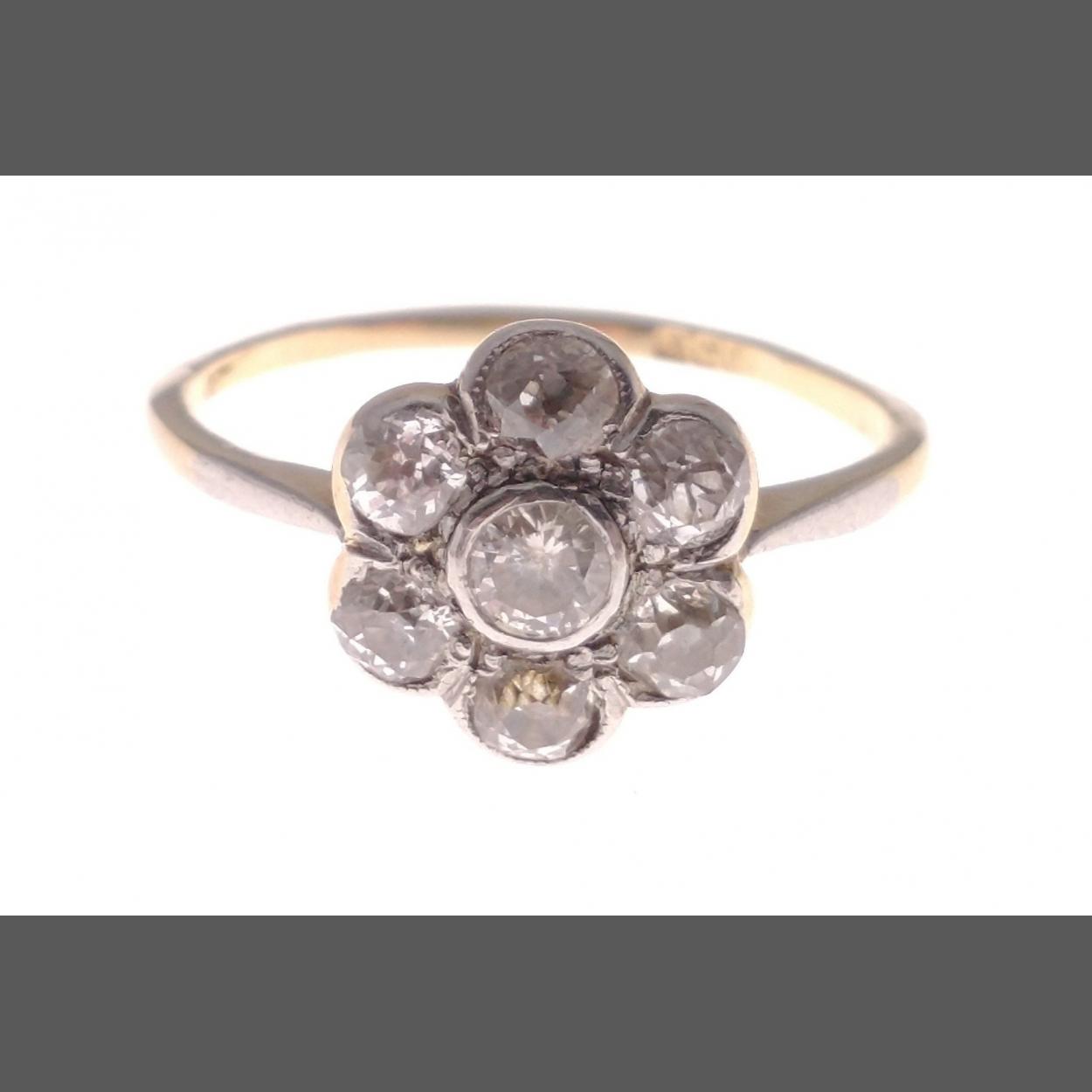 A 9 stamped floral form diamond ring with 6 smaller diamond petals each 2mm approx with 1 large central round cut diamond approx 4mm, size P/Q gross weight 2.23g approx