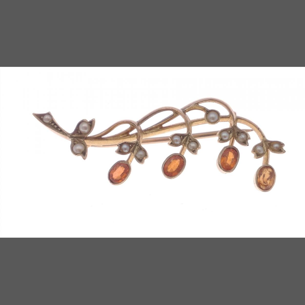 A 9ct stamped amber-like with small seed pearls, length 4cm approx, gross weight 3.40g approx