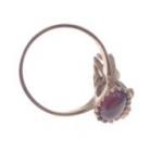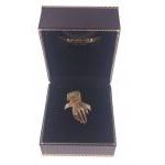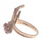 A stunning 9ct gold ring in the shape of a hand with diamond ring on finger and stones to cuff. Very reminiscent of Victorian age jewellery but the hallmarks are for London 1973. A truly stunning high quality, red stone possibly ruby in the cuff. Size N. Total gross weight 4.25g approx