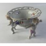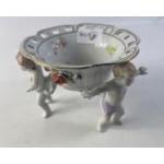 PMP 1817 stamp Porcelain pierced bowl supported on three cherubs holding their hands out - one child's thumb is missing, but all else is intact - dimensions 10.5cm height x 14cm diameter