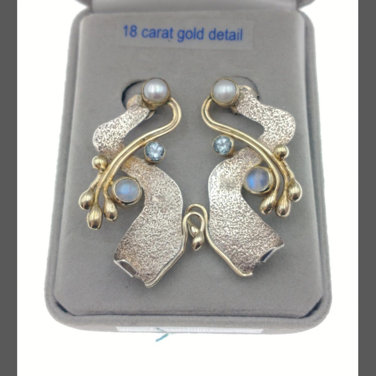 A pair of earrings stamped STG with pearls and opals and blue stones each approx 5cm long