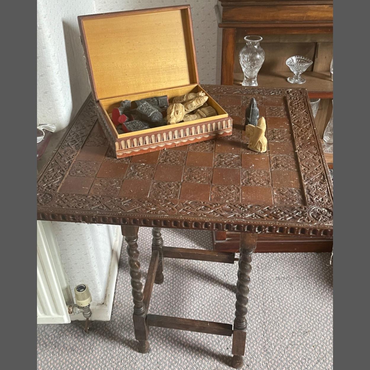 A VINTAGE chess board table in carved wood (the top lifts off) with carved barley twist legs and comes with some carved chess pieces (table comes with the chess board)