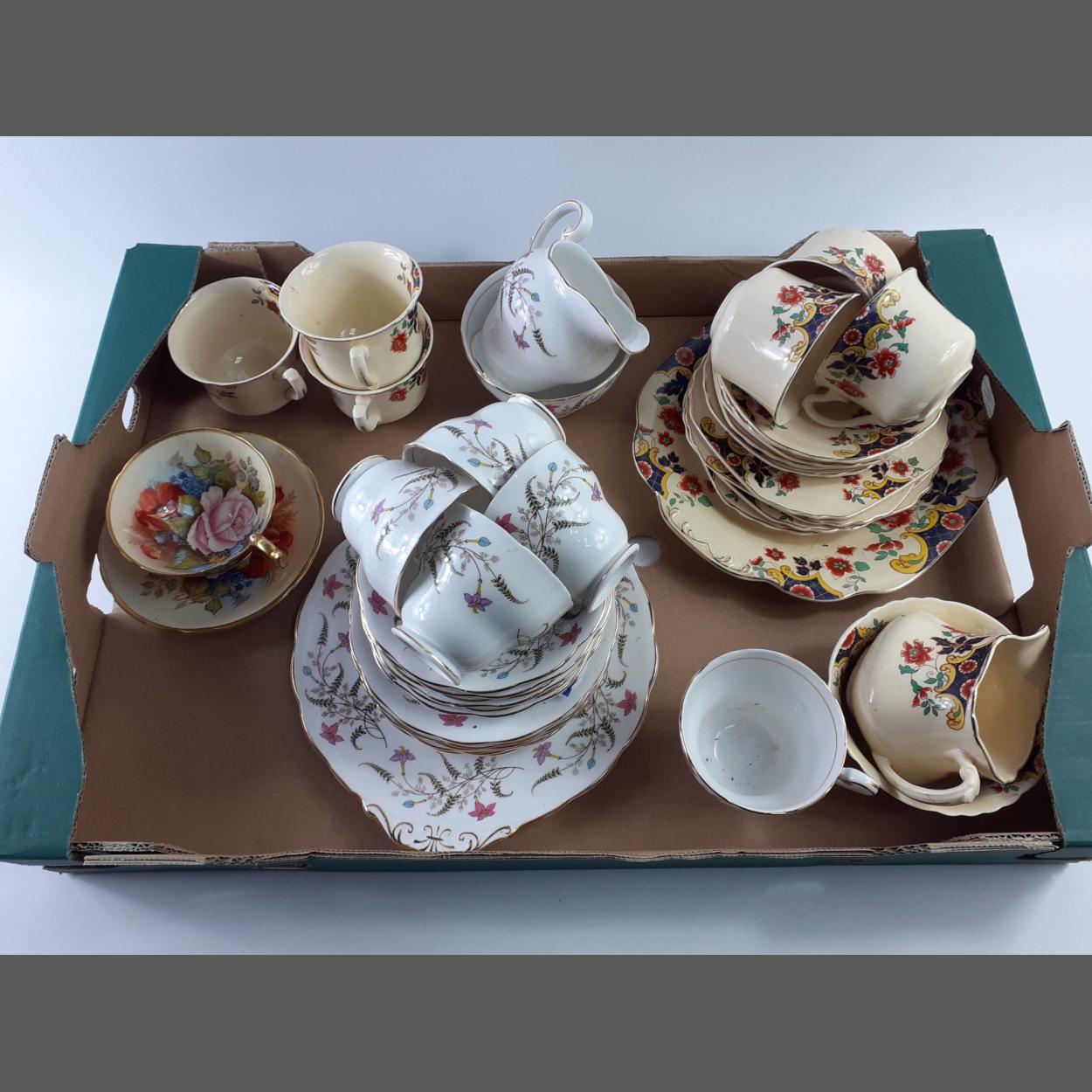 A rather lovely AYNSLEY duo of gilt cup and saucer with internal rose design plus two tea sets by WEDGWOOD and ROYAL STANDARD, the Wedgwood set comprising 6 cups, 5 saucers, 4 side plates, 1 cake plate (damage repaired) milk jug and sugar bowl, the Royal Standard set comprising 5 cups, 6 saucers, 6 side plates, 1 cake plate, milk and sugar