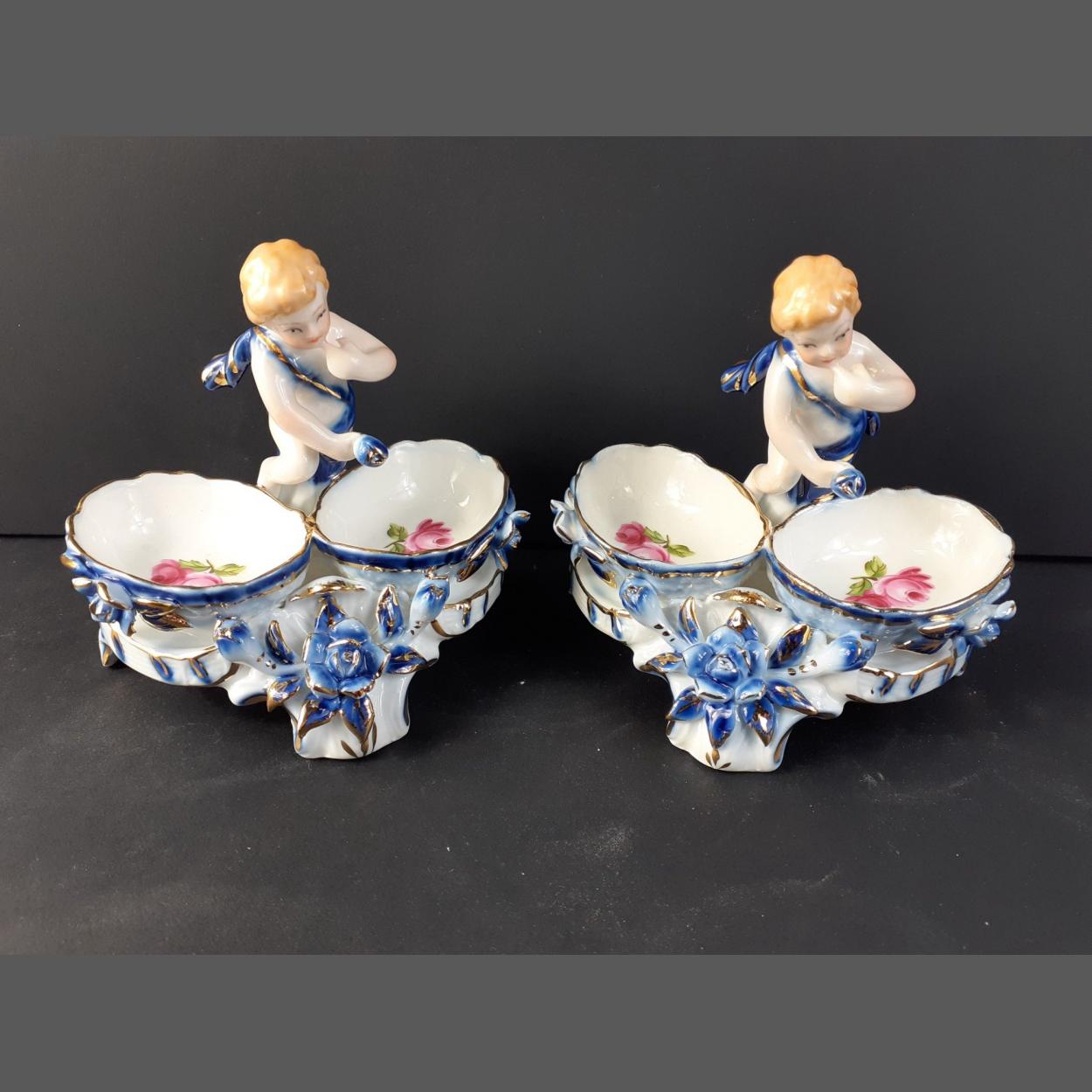 A pair of attractive late 19th century DERBY trinket dishes decorated with cherubs, gilt and roses, standing 12cm high, 11cm wide. No visible damage.