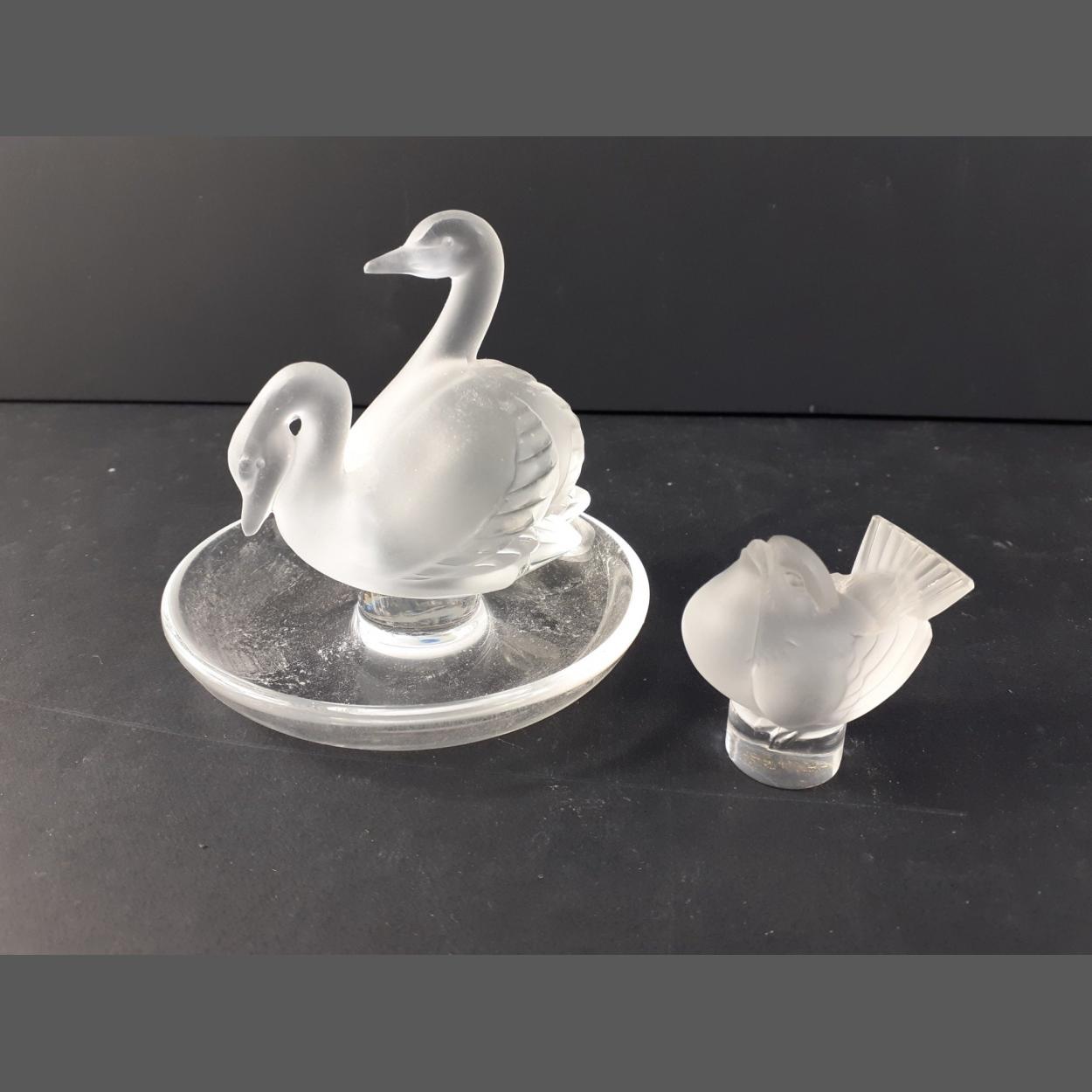 LALIQUE France signed crystal bird trinket dish/ pin tray. Also included a small Wren model stopper without base. Both Signed to LALIQUE to base and in good condition.