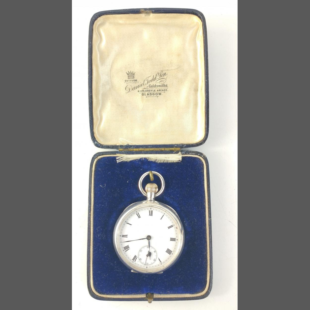 A lovely cased OMEGA silver pocket watch in full working order. Hallmarks on outer case for 1912, inner lid stamped 925 Movement marked OMEGA 4105305 with a Swiss stamp. The face is in lovely condition, there is a scratch on the crystal. Dial measures 40mm approx and the gross weight is 87.9g approx. Monogrammed initials to rear case and supplied in a fitted Glasgow retailer's box.