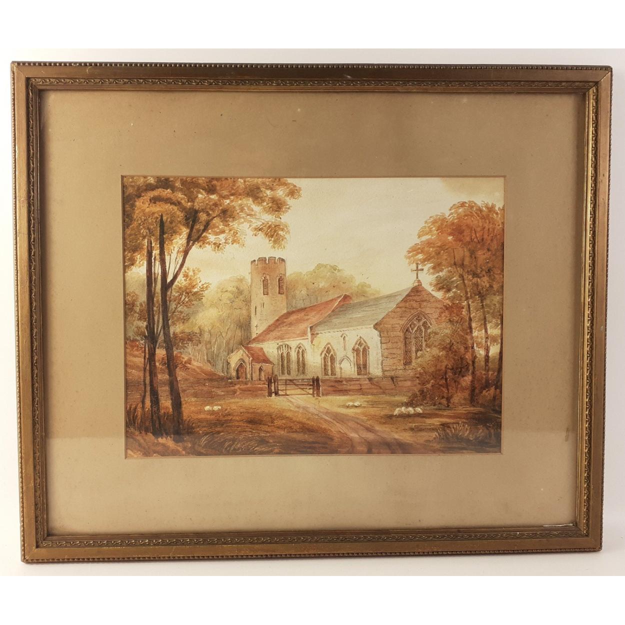 (3469) An original watercolour of an autumnal church scene frame size 45cm x 38cm, visible work 29cm x 21cm