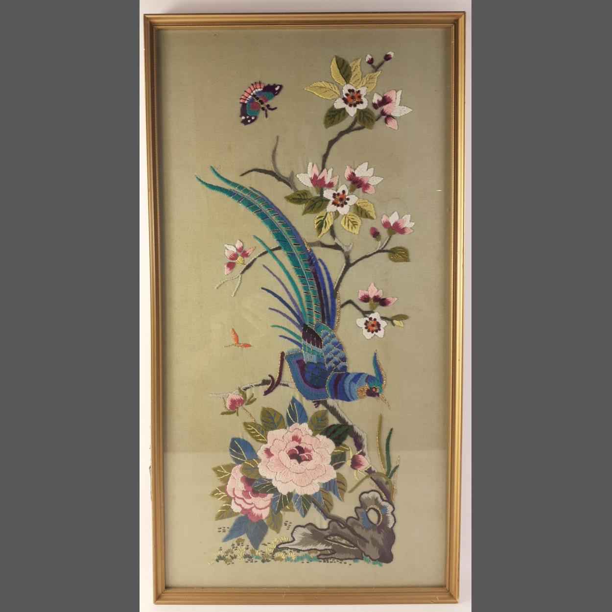 (408) A hand-worked embroidery of a bird of paradise with a butterfly and peony, frame measures 34cm x 63cm, backing needs restoration