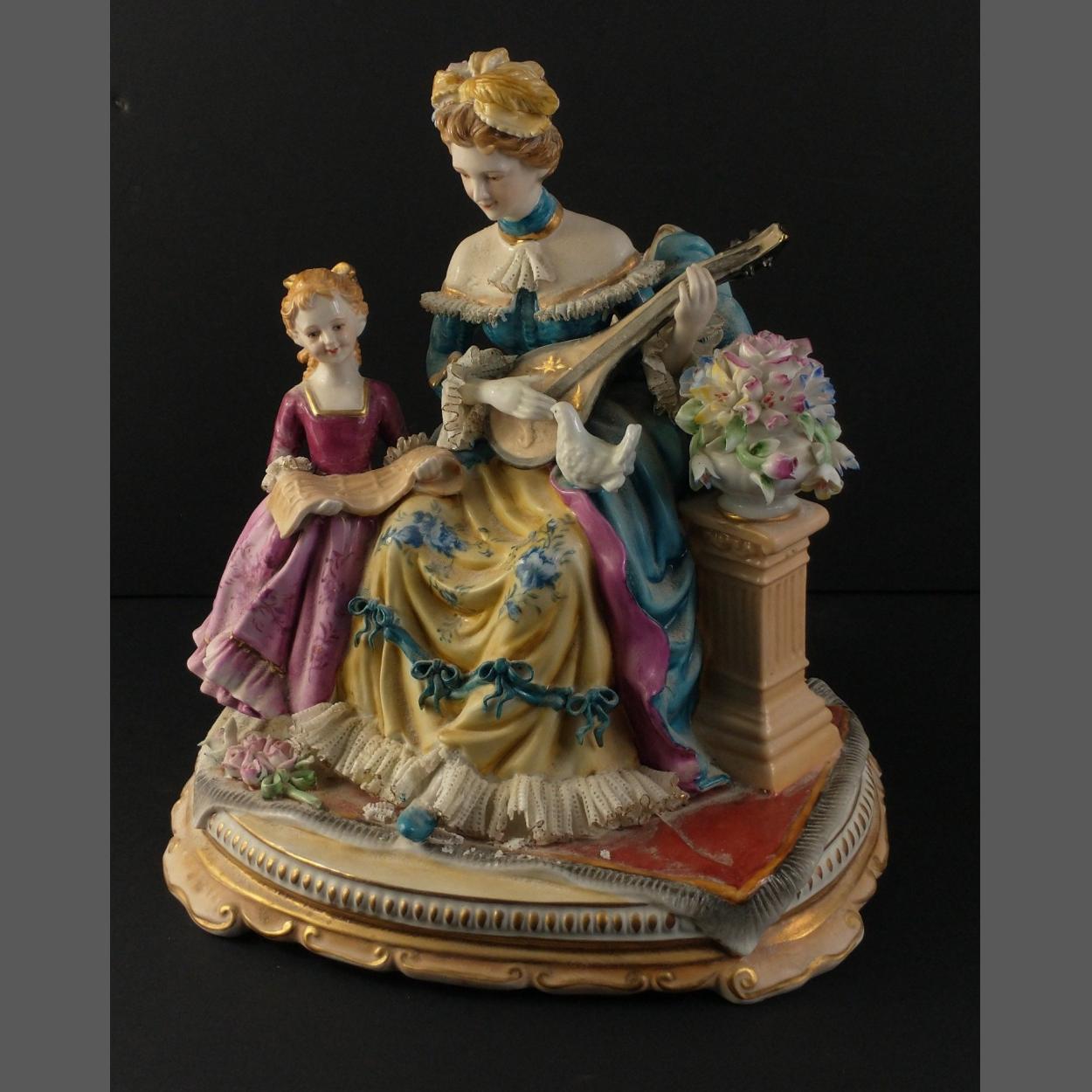 A vintage German porcelain figurine with a lady playing the lute accompanied by a girl holding sheet music. The lace around the principal figure's feet and child's dress have some damage but in generally good condition. Stands approx 33cm high. Would benefit from a clean.