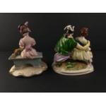 Two porcelain figurines, the first of a couple (approx 18cm high) with German stamp to base of a crown over 'R' and Saxe, and the second of a Capodimonte lady studying a bouquet of flowers (approx 19cm high)