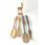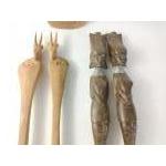 Two pairs of wooden African salad servers one pair with antelopes (33cm long), the other with stern looking women (36cm long) plus a wooden antelope figurine 20cm high (damage to one horn)
