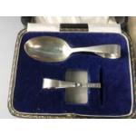 Four boxed sets of silver hallmarked silver cutlery to include 6 pastry forks (Sheffield 1931, weight 103g, 13.5cm long), 6 knives with horn handles (Sheffield 1901, gross weight 151g, 18cm long with 2 damaged handles), 6 silver handled butter knives (Sheffield 1930, gross weight 163g approx 17cm long), a baby's spoon and separate handle (Sheffield 1925, 52g approx 11cm long),