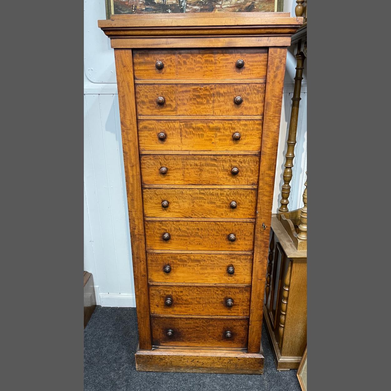 An EDWARDIAN TOP QUALITY tall 9 drawer chest of drawers with original wooden knob drawer handles, with a right-hand side secure lockable bar with key - in stunning condition! - dimensions 64" tall x 7" wide x 17" depth approx