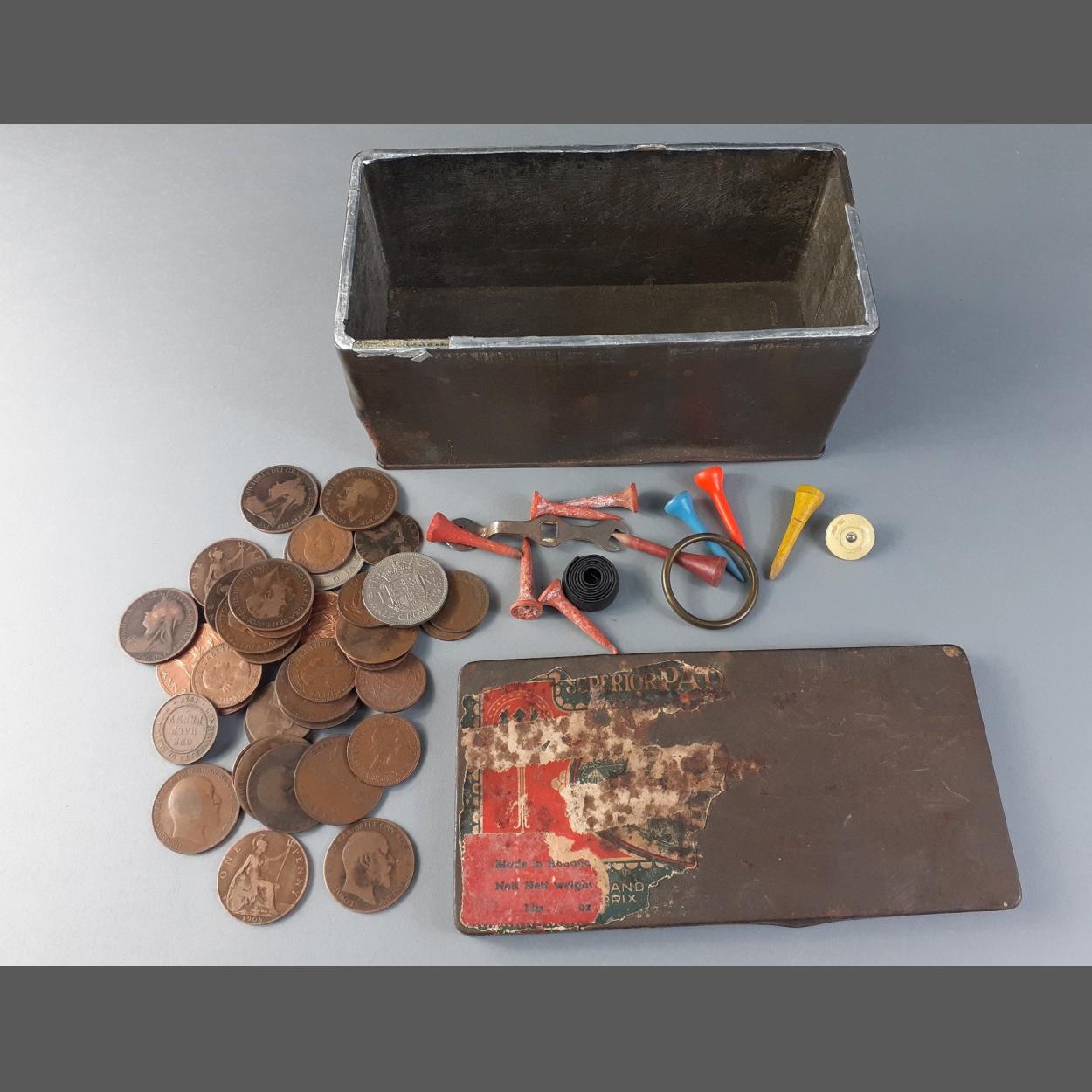 A small quantity of non-precious obsolete United Kingdom coinage in an old tin.