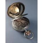 A large Goliath size 8 Day pocket watch in working condition. Lid stamped Argentum Swiss Made 1385012. Movement marked Brevet 33236. Measures approx. 6cm across. The bevelled crystal is sadly cracked.