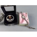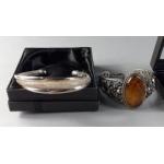 An assorted bag containing an amber stoned silver cuff bangle, a silver yellow stoned thistle brooch, a 925 marked CIRO marcasite cocktail watch and a white metal bracelet