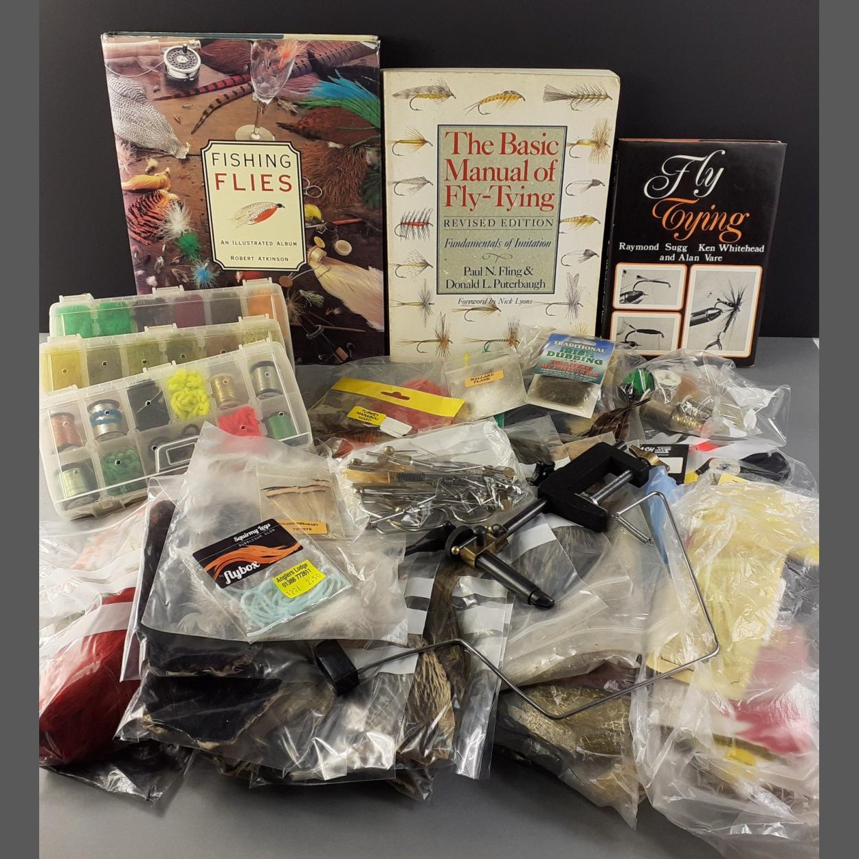 A lovely quantity of fly-tying materials, tools, and reference material. Includes feathers, dubbing, threads, tinsels etc. Desktop vice and tools. An excellent collection for the enthusiast or beginner.