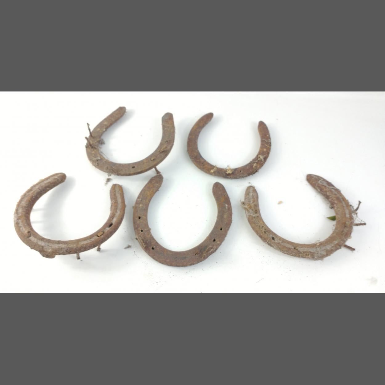 A group of five lucky and rusty old Horse Shoes some still with nails. What sort of horse did these come from, maybe a full set and a spare in the boot?