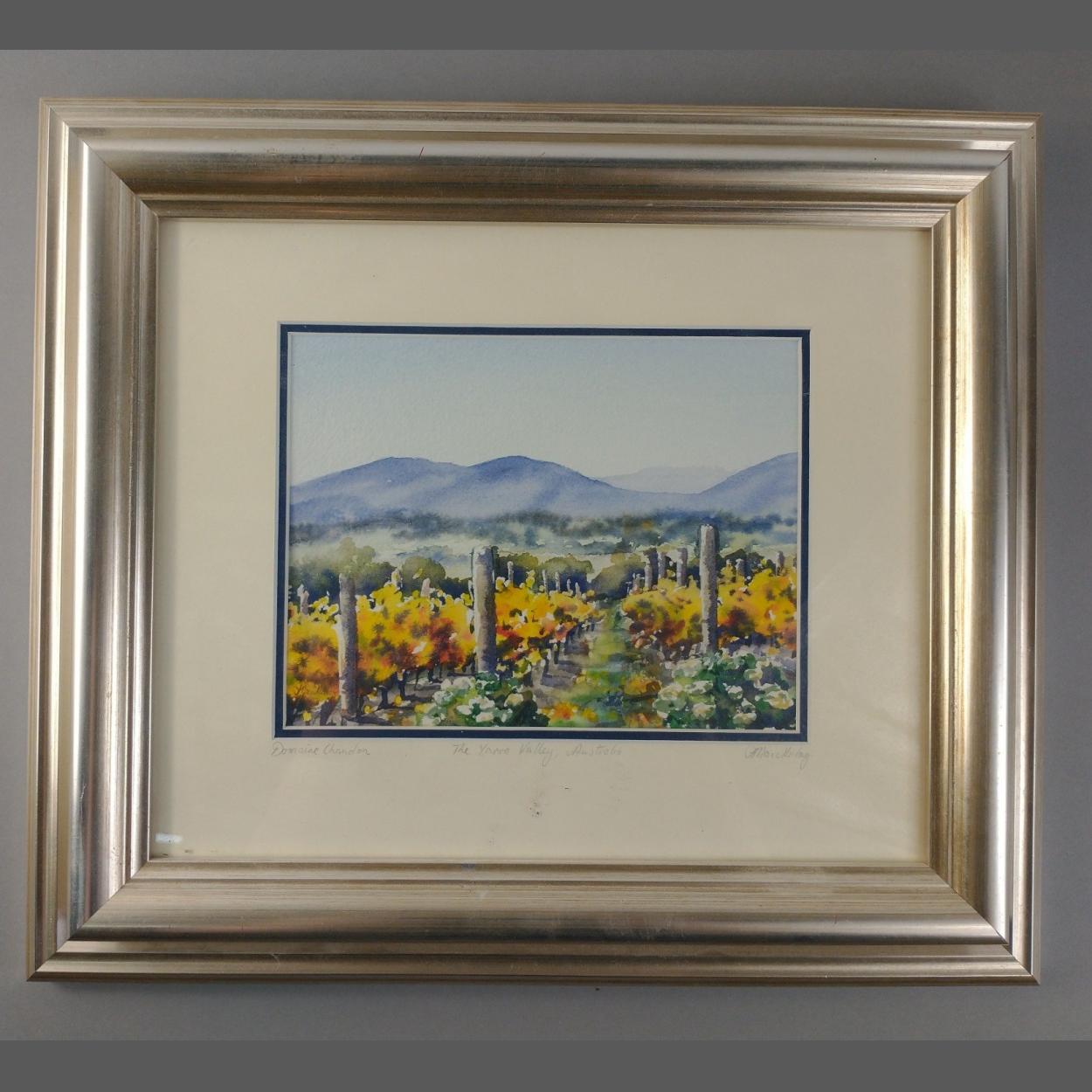 An original water colour painting of "Domaine Chandon - The Yarra Valley, Australia". The frame measures approx. 39cm in length x 34cm in height. Original painting measures approx. 20cm in length x 15cm in height.