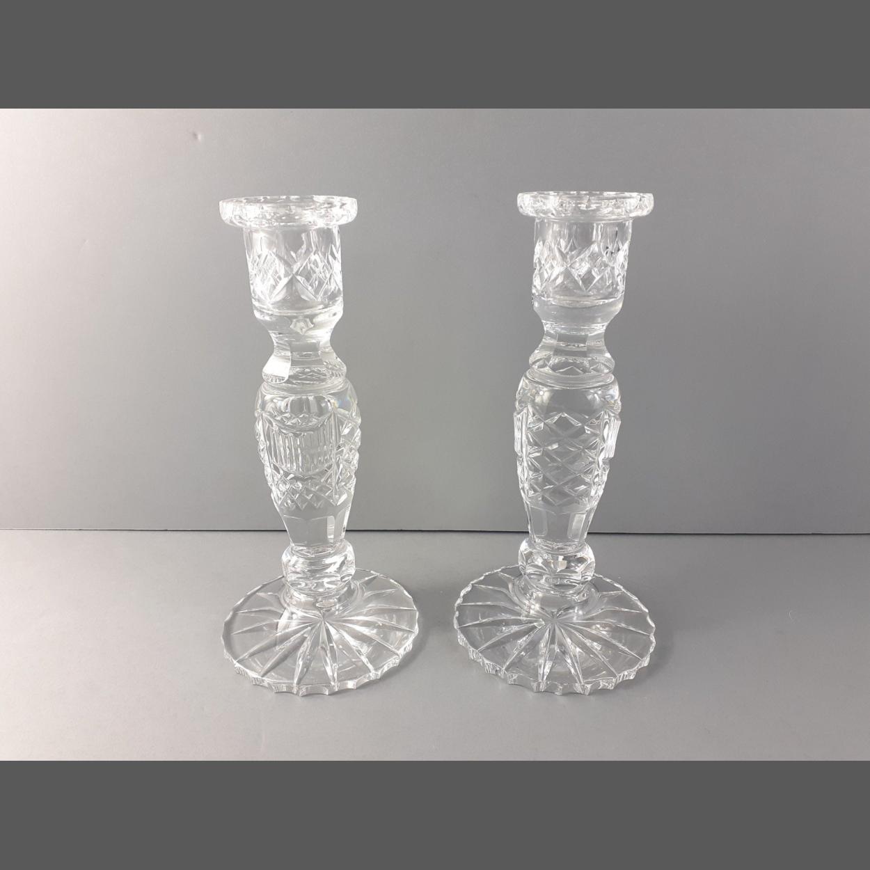 A lovely pair of crystal candlesticks with star cut bases and attractive stylistic columns. Each standing 22cm high approx and both in excellent condition with no damage